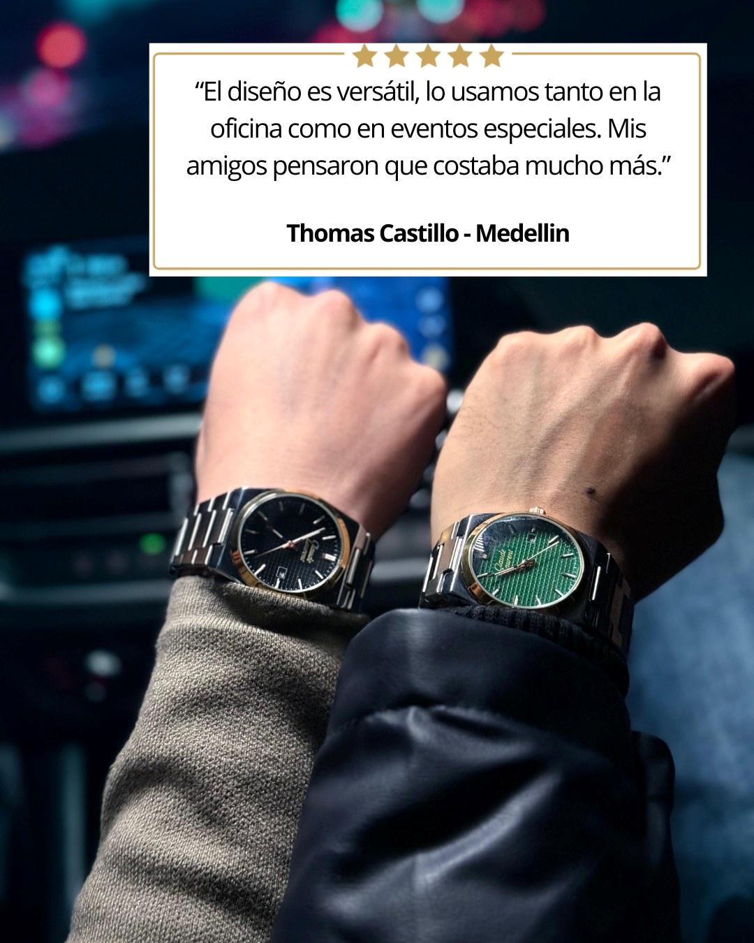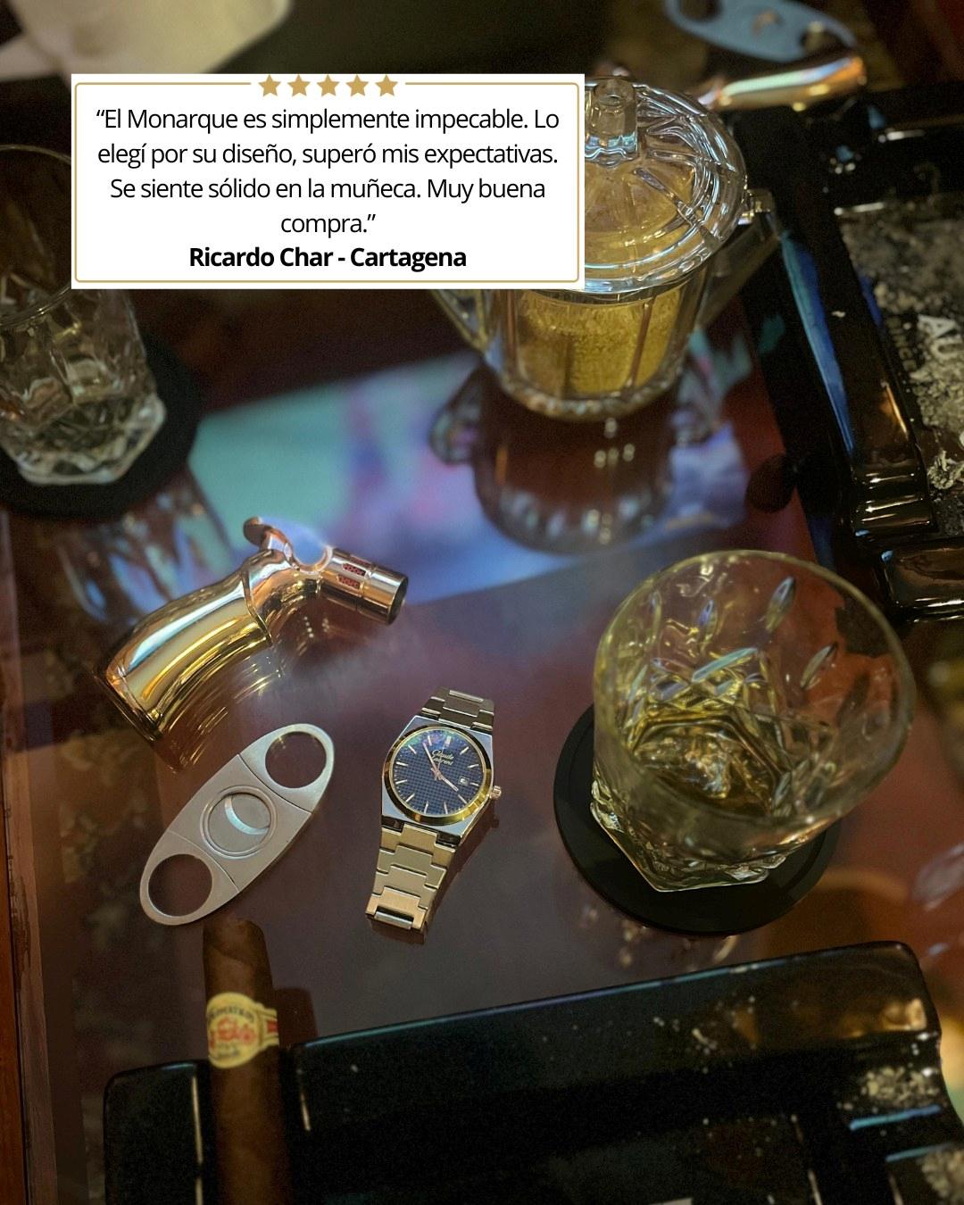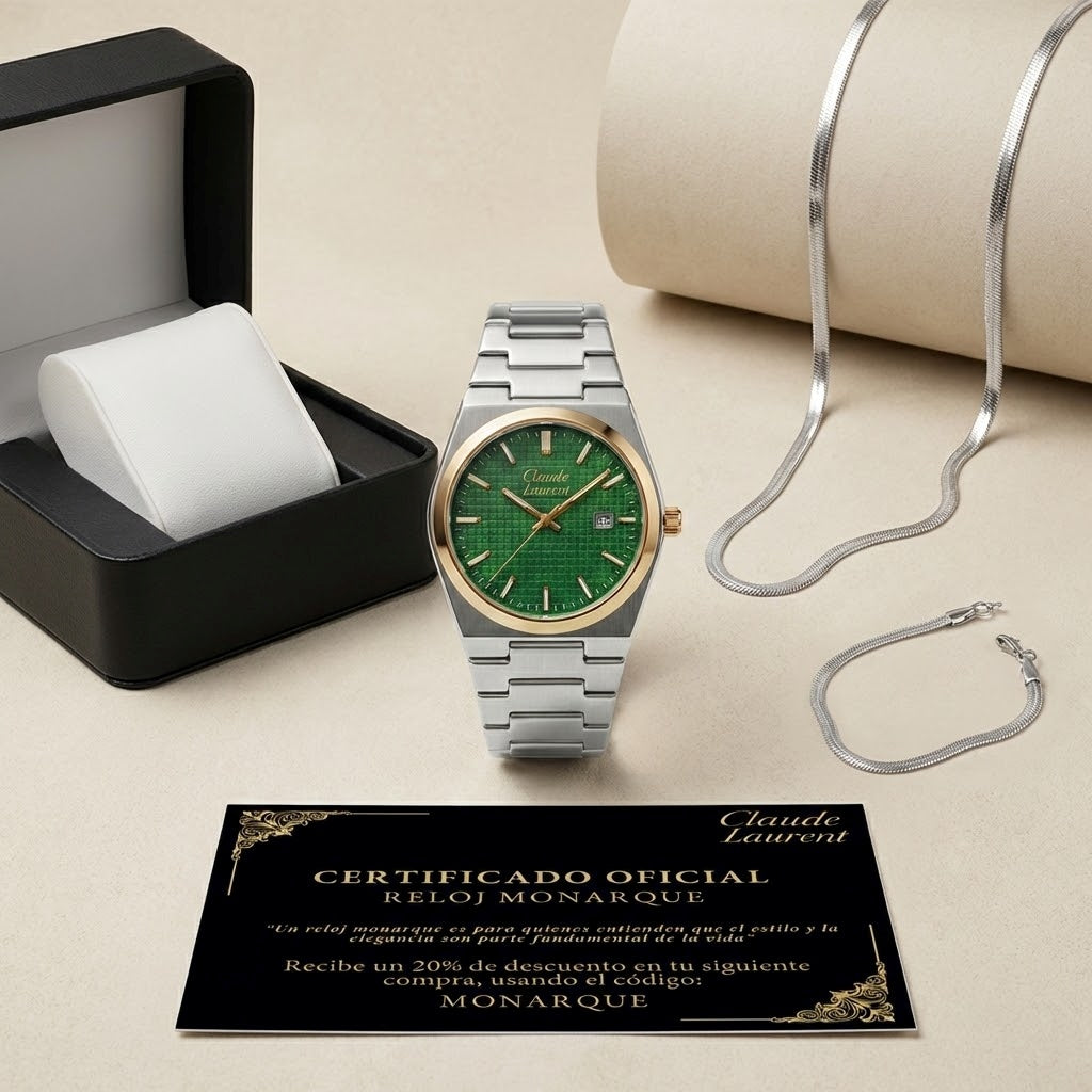 Con tu compra recibes un reloj Claude Laurent Monarque, Caja de lujo color negra, Set Montecarlo (pulsera, collar, anillo) y un certificado de autenticidad.